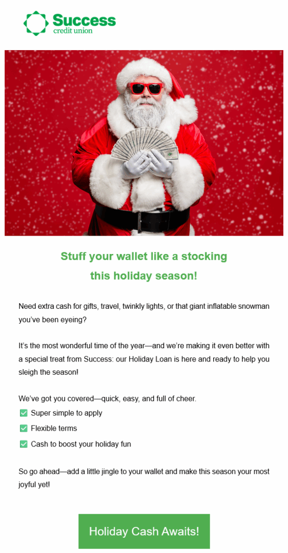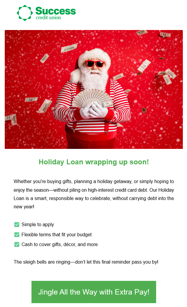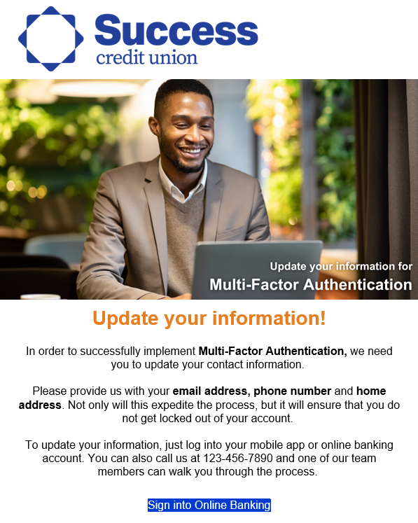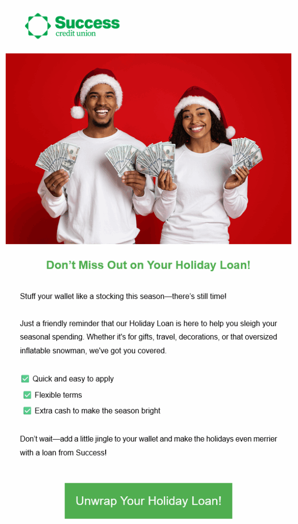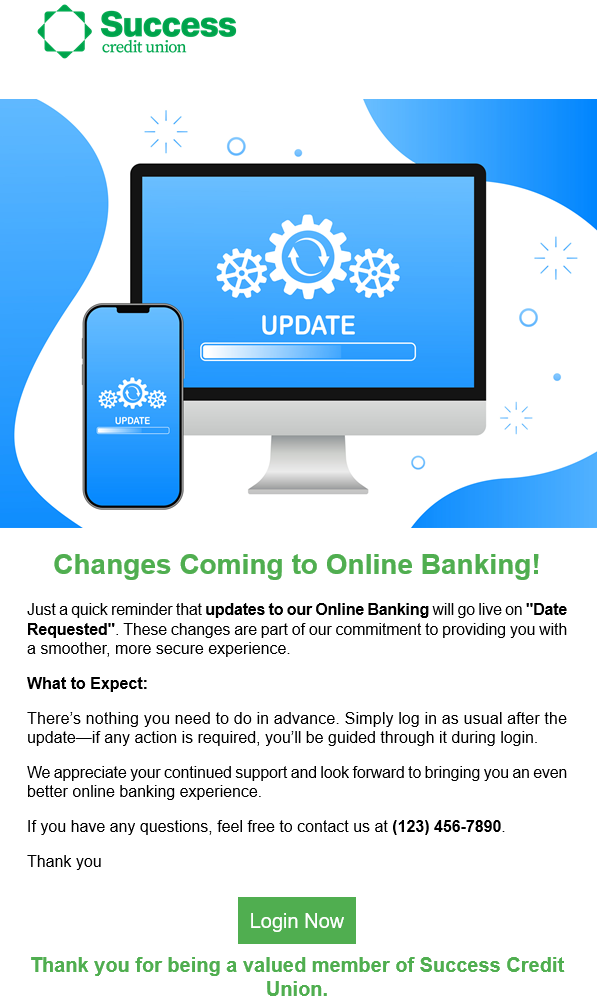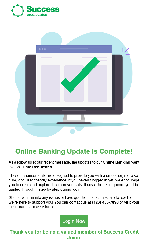Quick execution using pre-built content branded to your credit union. Includes HTML email branding, Online Banking message creation, standard audience, and standard reporting. Additional reporting is available upon request; additional fees may apply.